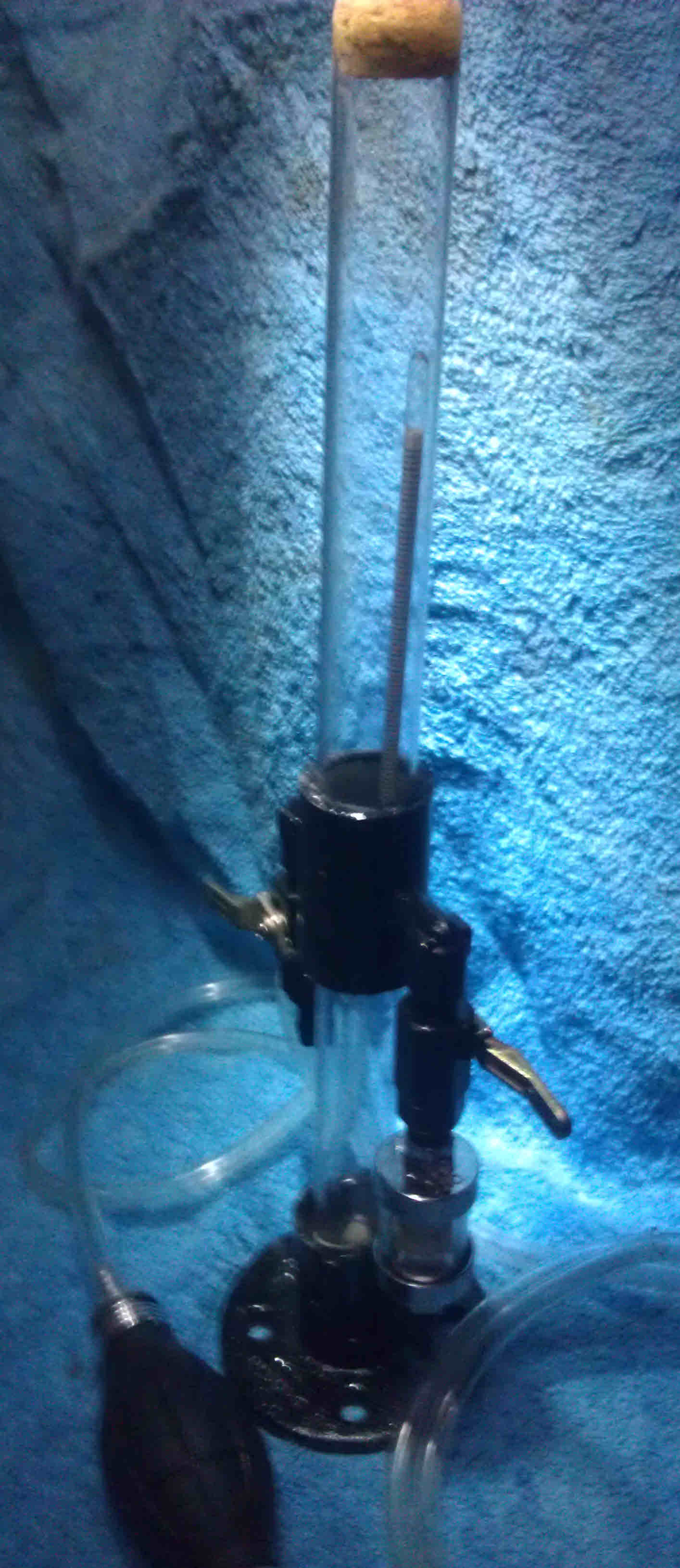 To use this item, you open both valves, and turn the unit perpendicular to the ground - that is horizontal - and insert the suction tube in the fuel (or tank) and pump as necessary to fill the device, then close both valves and then tilt it back up vertical.  The hydrometer will float in the fuel.  If you pumped in too much fuel and the top of the hydrometer is contacting the cork bumper, open the drain side and let some fuel out until the hydrometer is free floating both upper and lower in the fuel.